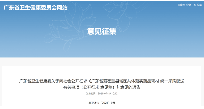 為提高縣域醫(yī)療衛(wèi)生資源配置和使用效率,7月19日,廣東省衛(wèi)健委官網(wǎng)發(fā)布《廣東省緊密型縣域醫(yī)共體落實藥品耗材統(tǒng)一采購配送有關(guān)事項(公開征求意見稿)》(以下簡稱《意見稿》),對其公開征求意見。這份僅有800余字的意見稿,字雖少但信息量大。