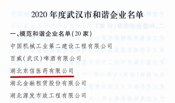 7月,武漢市人民政府辦公廳發(fā)布“2020年度武漢市和諧企業(yè)”名單,湖北東信醫(yī)藥有限公司等二十家企業(yè)被評(píng)名為“2020年度武漢市模范和諧企業(yè)”。