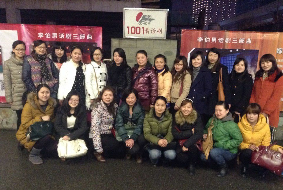 公司女員工在觀看話劇后在武漢人民藝術(shù)劇院合影