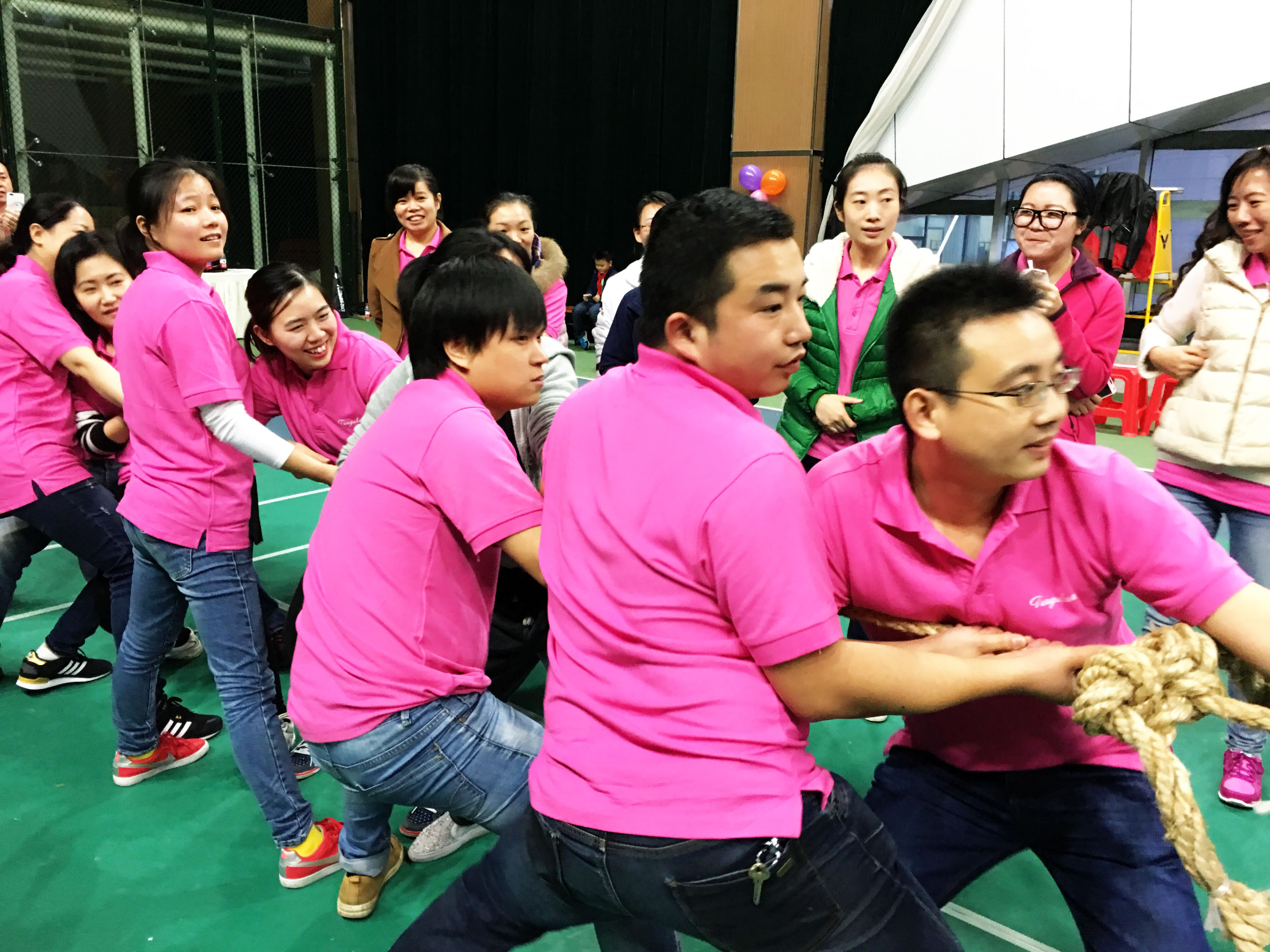 在隨后的拔河比賽中,參賽運動員分為四個小隊交叉比賽,經(jīng)過三場緊張激烈的爭奪,紅隊派出的十名隊員贏得了拔河比賽的勝利。