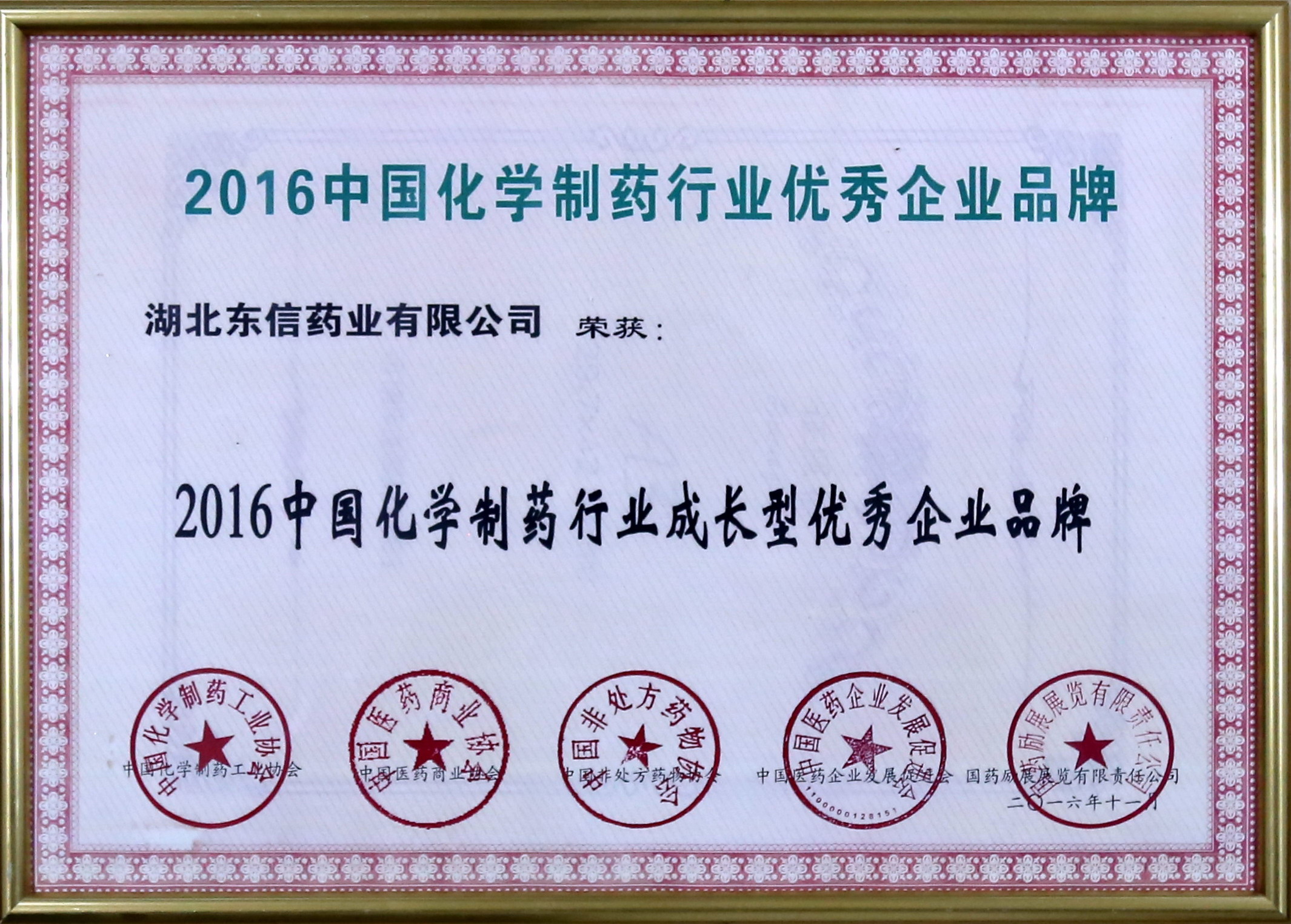 2016年11月15日,湖北東信藥業(yè)有限公司在由中國化學(xué)制藥工業(yè)協(xié)會(huì)、中國醫(yī)藥商業(yè)協(xié)會(huì)、中國非處方藥物協(xié)會(huì)、中國醫(yī)藥企業(yè)發(fā)展促進(jìn)會(huì)、國藥勵(lì)展展覽有限責(zé)任公司等單位在武漢共同成功舉辦的以“質(zhì)量、誠信、品牌”為主題的“2016’中國化學(xué)制藥行業(yè)年度峰會(huì)”上榮獲嘉獎(jiǎng)。