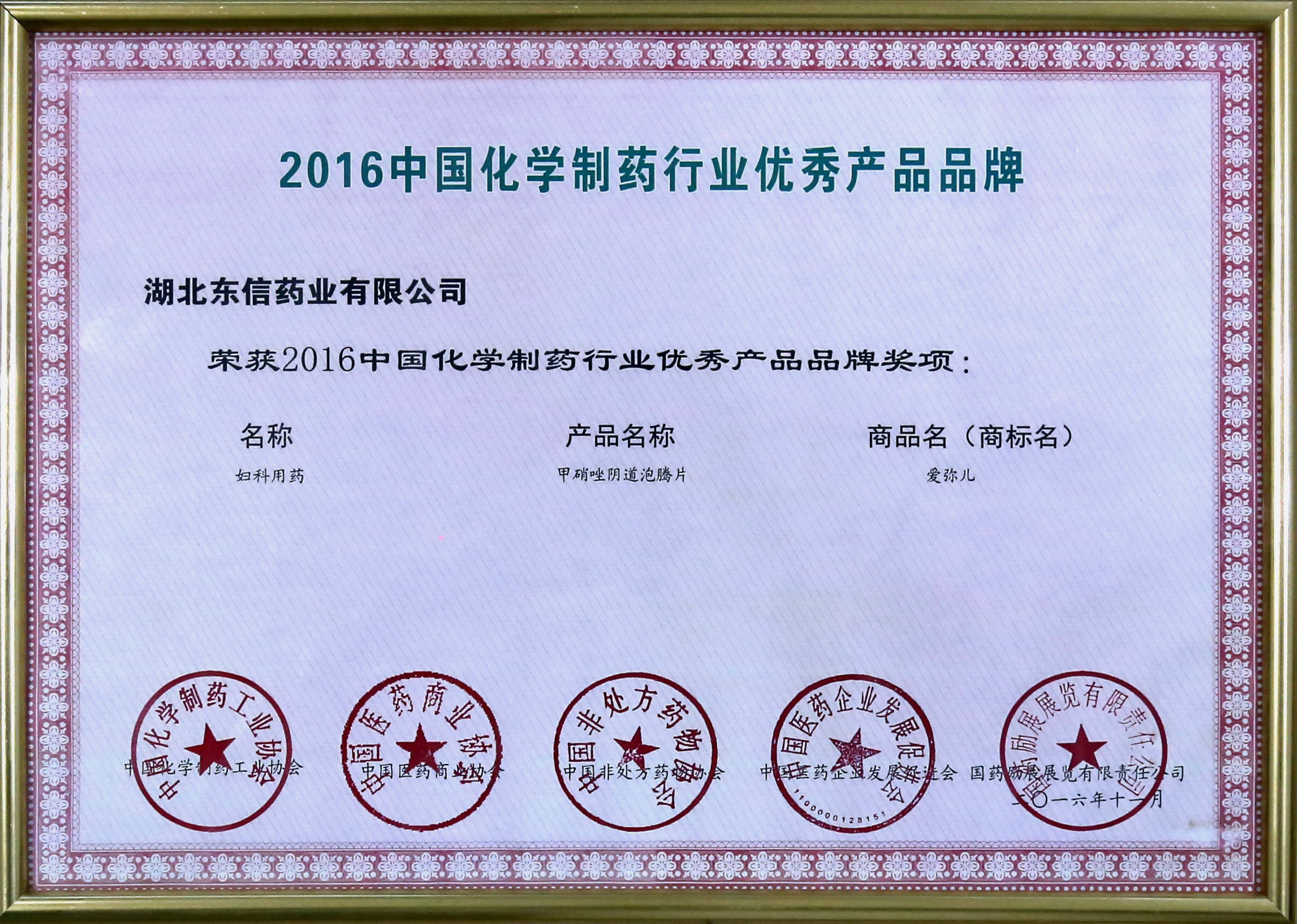 作為峰會(huì)的重要組成部分,期間發(fā)布了“2016’中國化學(xué)制藥行業(yè)優(yōu)秀企業(yè)”等4大板塊28個(gè)獎(jiǎng)項(xiàng)。湖北東信藥業(yè)有限公司榮獲“2016年中國化學(xué)制藥行業(yè)成長(zhǎng)型優(yōu)秀企業(yè)品牌”,旗下婦科用藥——愛彌兒甲硝唑陰道泡騰片獲得“2016年中國化學(xué)制藥行業(yè)優(yōu)秀產(chǎn)品品牌”獎(jiǎng)。