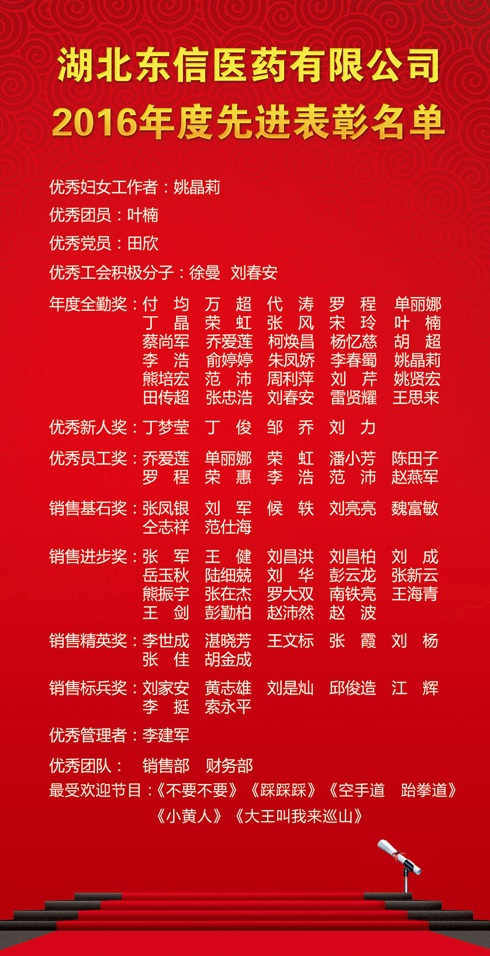 在精彩的節(jié)目進行過程中,公司表彰大會也穿插進行。公司董事長田南希女士、總經(jīng)理陳向先生、副總經(jīng)理營銷總監(jiān)李建軍先生、各職能部門領(lǐng)導(dǎo)以及來自東信藥業(yè)、東信醫(yī)藥科技、美洛酒業(yè)等相關(guān)領(lǐng)導(dǎo)相繼揭曉了“東信醫(yī)藥2016年度表彰大會”的各個獎項,并向獲得榮譽的先進團隊和個人頒發(fā)獎品及榮譽證書。