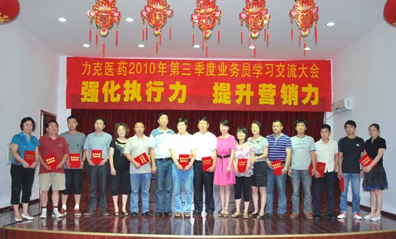 參會的業(yè)務(wù)員、推廣員、維護(hù)員發(fā)言結(jié)束后,大會進(jìn)入頒獎環(huán)節(jié)。在2010年上半年銷售工作中表現(xiàn)突出、完成上半年回款任務(wù)的業(yè)務(wù)員劉家安、索永平、張霞、劉世燦、邱俊造、田立和、姚章英、胡吉、黃紅莉、李家旺、劉昌洪、王海青被評為上半年優(yōu)秀業(yè)務(wù)員。田南希董事長、銷售部朱生兵部長向獲獎人員頒發(fā)了榮譽(yù)證書并合影留念。會后,這些優(yōu)秀業(yè)務(wù)員連夜趕赴上海,參加主題為“贏在市場,榮耀世博”的世博游活動。