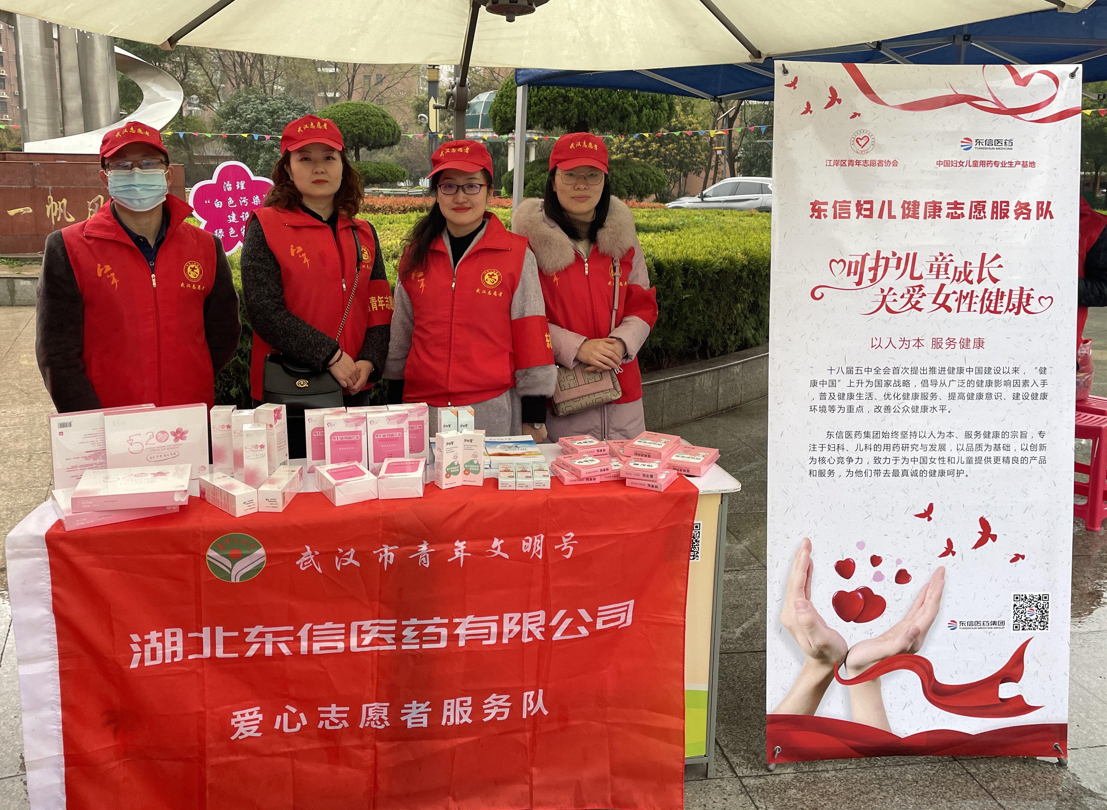 春風(fēng)送暖,愛心送情。2021年3月5日是全國(guó)第58個(gè)學(xué)雷鋒紀(jì)念日,湖北東信醫(yī)藥有限公司聯(lián)合江岸區(qū)志愿者協(xié)會(huì),組織愛心志愿服務(wù)隊(duì)在江北社區(qū)錦湖花園和漢口城市廣場(chǎng)設(shè)立展臺(tái),為社區(qū)居民宣講婦女兒童健康知識(shí),普及安全用藥理念。